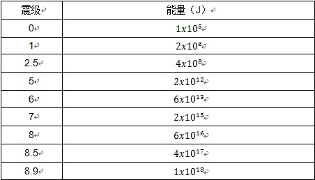 震级(seismic level) 表示地震强度的级别。与地震释放的能量有关。以100km外的地震仪来检测地震能量,每增大两级相当于地震能量增大1000倍,见下表。